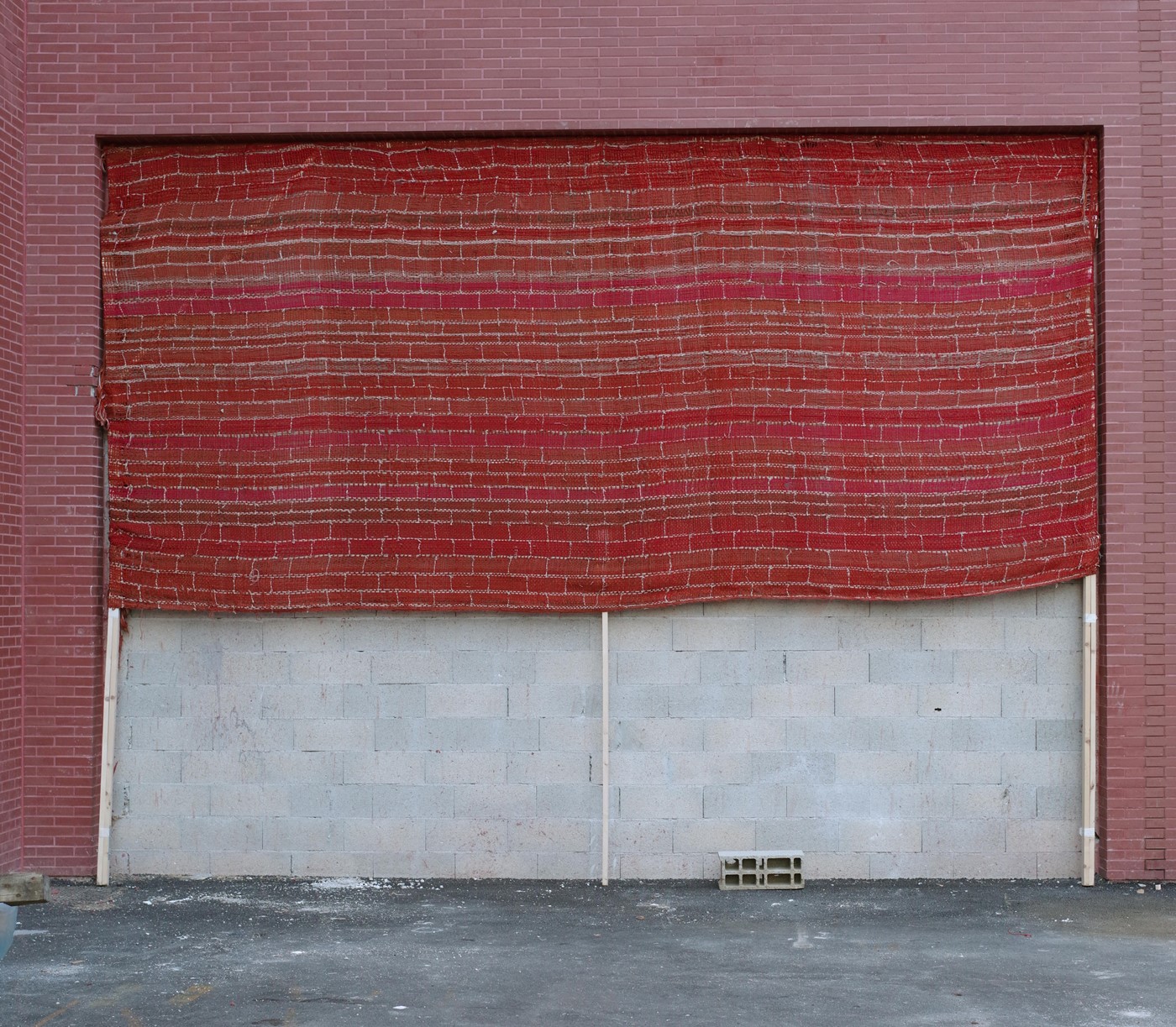 Il telo tessuto alloggiato sul muro come una tenda, si pone come per coprire il foro retrostante riprendendo le stesse caratteristiche visive dei mattoni ma con una resistenza diversa.